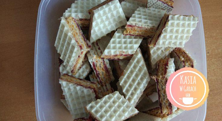 - Pierwszy płat wafla smarujemy powidłami porzeczkowymi i na wierzch przykładamy je drugim płatem wafla.