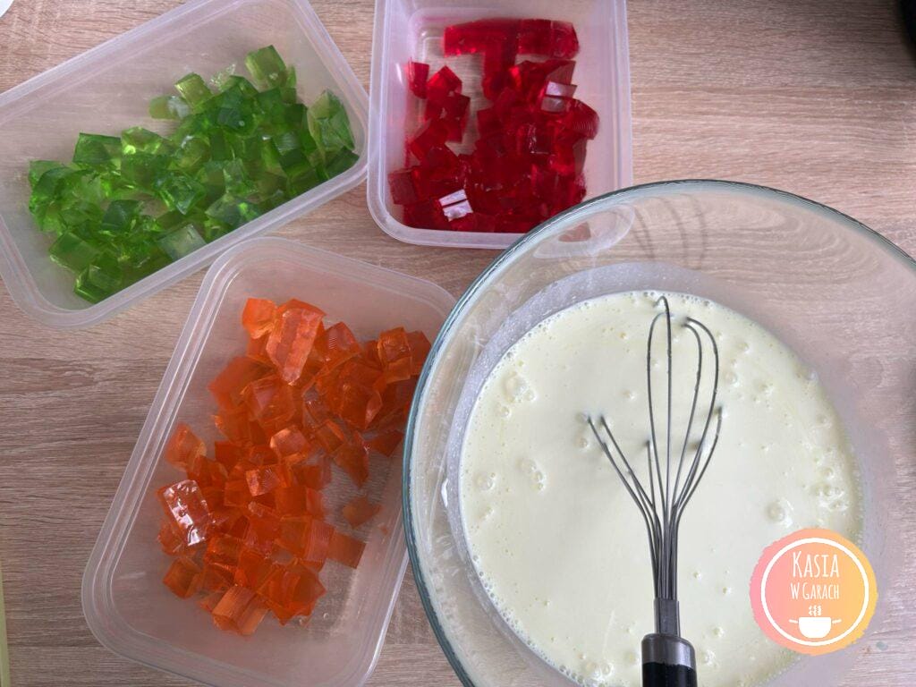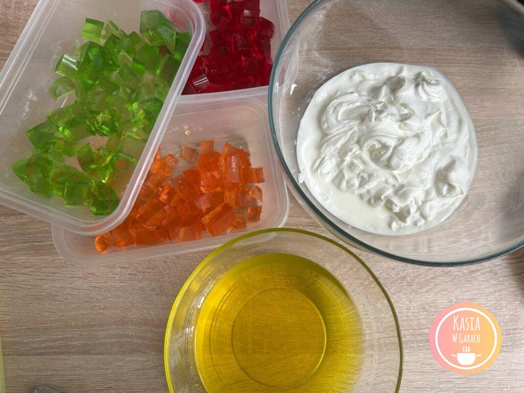 4. Galaretkę czerwoną, pomarańczową oraz zieloną kroimy w kostkę.