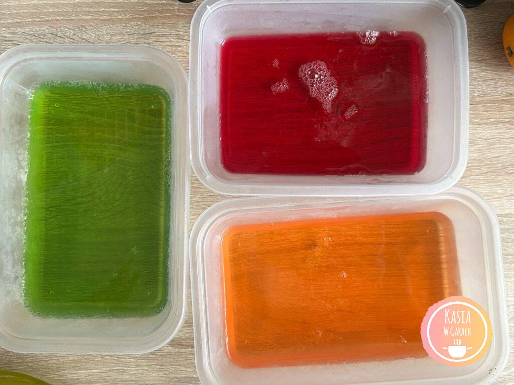 1. Galaretkę czerwoną, pomarańczową oraz zieloną rozpuszczamy w osobnych miskach dodając po 1 szklance gorącej wody ( szklanka o pojemności 250ml) i dokładnie mieszamy. Po wystudzeniu przelewamy do pojemników, pozostawiamy je do całkowitego zastygnięcia.