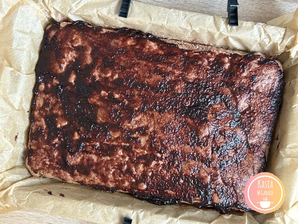 - Gdy mamy już wymieszane wszystkie składniki, wylewamy ciasto na blaszkę pokrytą papierem do pieczenia, ja użyłam blachy o wymiarach 31×21 cm i dokładnie je rozprowadzamy po całej blaszce. Pieczemy około 30 minut w temperaturze 180 stopni grzanie góra-dół do suchego patyczka.