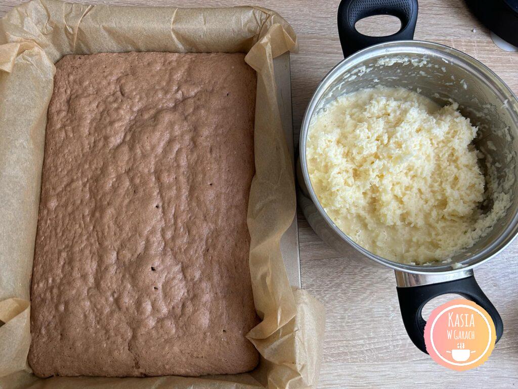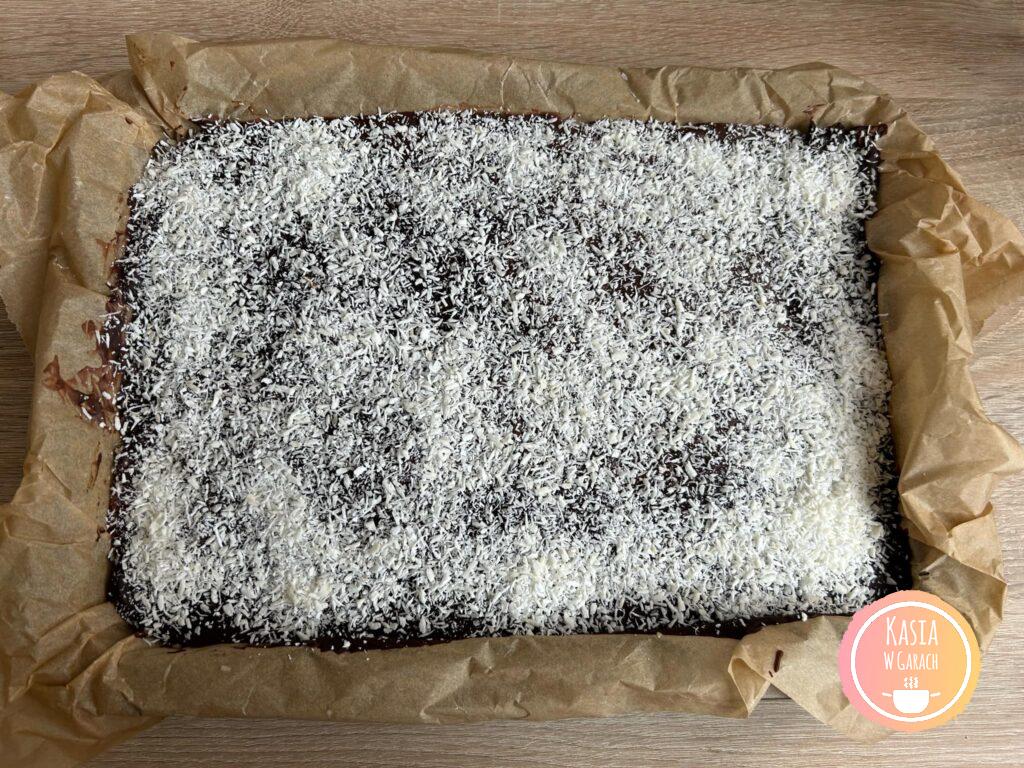 - Lekko zgęstniałą polewę wylewamy na nasze ciasto i dokładnie ją rozprowadzamy. Posypujemy kokosem.