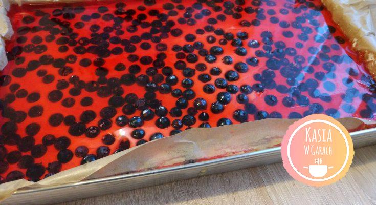 - Na krem układamy borówki i zabieramy się za przygotowanie galaretki. Rozrabiamy w wodzie 2 opakowania truskawkowej galaretki (w mniejszej ilości wody niż zaleca producent) i gdy trochę stężeje to wylewamy ją na wierzch naszego ciasta.