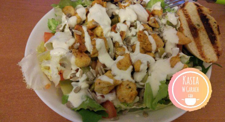 - Sałatka najlepiej smakuje z grzankami z bagietki czosnkowej. Można ją dostać w biedronce albo już upieczoną albo gotową do upieczenia w piekarniku (obie są dobre 😉 ).