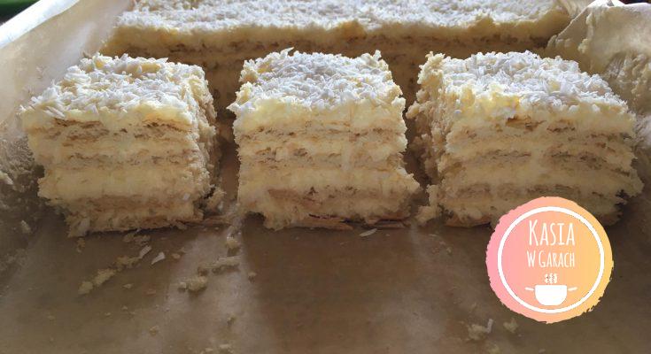 Blaszkę wykładamy papierem do pieczenia. Na spod kładziemy pierwsza warstwę krakersów. Masę dzielimy w misce łyżka na 4 części. 1/4 wykładamy na krakersy. Na masę układamy kolejna warstwę krakersów i 1/3 masy… itd… wierzch posypujemy pozostałym kokosem, zakrywamy folia spożywcza i wstawiamy na noc do lodówki żeby ciasto stężało a krakersy zmiękły.