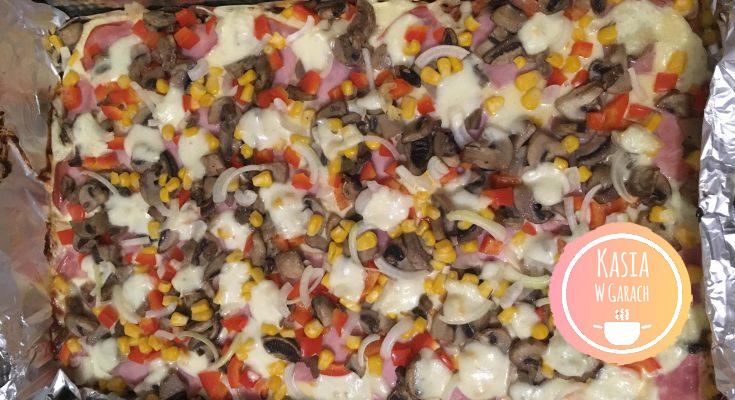 - ulubione dodatki ( u mnie 6 większych podsmażonych pieczarek, 6 plasterków szynki, pół cebuli pokrojonej w piórka, pół papryki, duża garść kukurydzy,)