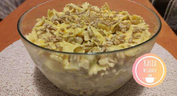 - do dużej miski przekładamy makaron, dodajemy usmażonego kurczaka, odcedzoną kukurydzę, 3/4 uprażonych nasion słonecznika,
