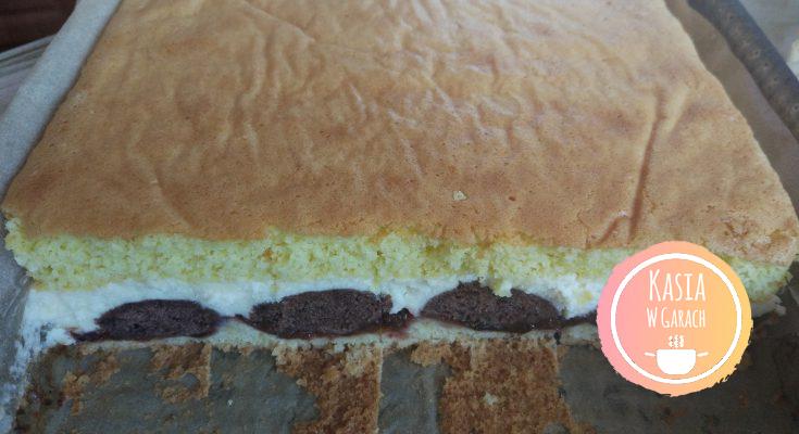 - zmiksowaną masę wykładamy na wystudzone kruche ciasto z dżemem, przykrywamy biszkoptem,