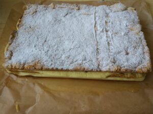 🍰 Ciasto Pani Walewska – kruche ciasto z bezą, dżemem porzeczkowym i kremem budyniowym.