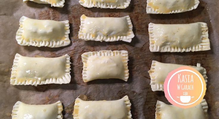 - pierożki układamy na wyłożonej papierem do pieczenia blaszce, smarujemy roztrzepanym jajkiem i pieczemy na złocisty kolor, ok 15-20 min