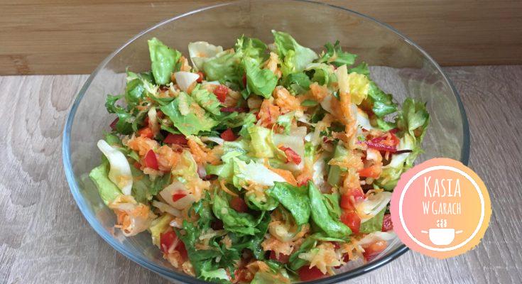 Przepyszna lekka surówka z warzyw które akurat miałam w lodówce z domowym sosem winegret. Lekka kwaskowatość sosu w połączeniu ze słodyczą jabłka i marchewki idealnie się razem komponują. Świetny dodatek do wielu dan obiadowych.