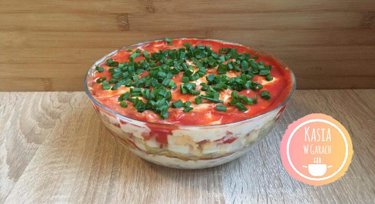 - na ketchup wykładamy i rozprowadzamy równomiernie sparzonego pora, następnie wykładamy i rozprowadzamy pokrojone ugotowane jajka, na jajkach rozprowadzamy warstwę czerwonej papryki, paprykę lekko obsypujemy przyprawą curry, następnie kładziemy drugą warstwę majonezu i ketchupu,