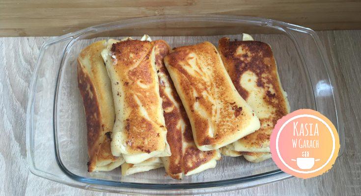 - rozrabiamy ciasto na naleśniki i smażymy 8 dużych naleśników, następnie usmażone odstawiamy na ok 5 min do lekkiego przestygnięcia, po tym czasie smarujemy naleśniki ruskim farszem i zawijamy jak krokiety, ( ja farsz rozłożyłam sobie w pojemniku równomiernie, następnie podzieliłam go nożykiem na równe 8 części, dzięki temu uzyskałam w miarę jednakową ilość farszu do każdego naleśnika :))