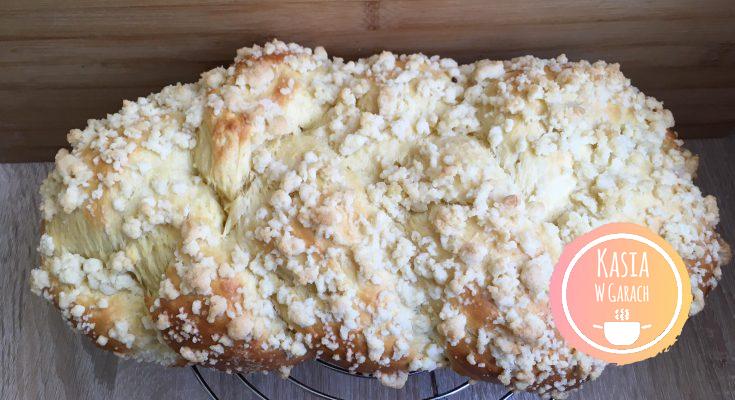 - pozostałe białko jaja roztrzepujemy z mlekiem, smarujemy nim chałkę sylikonowym pędzelkiem i posypujemy po wierzchu kruszonką,