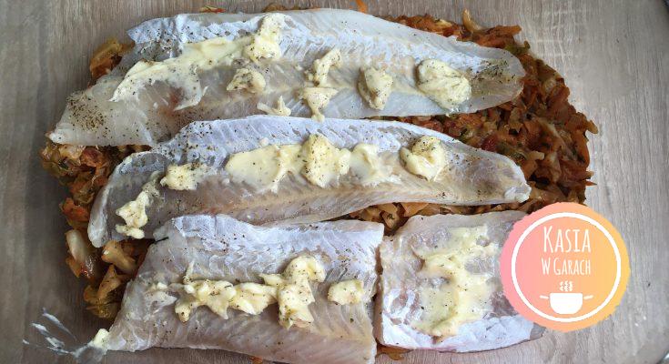 • kapustę przekładamy do naczynia żaroodpornego, na wierzch kładziemy filety rybne. Na wierzchu ryby kładziemy/rozsmarowujemy trochę masła. ,
