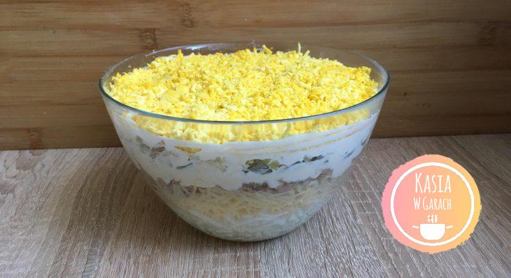 Przepyszna i bardzo prosta w przygotowaniu warstwowa sałatka jajeczna z tuńczykiem, serem oraz ogórkiem konserwowym. Idealna na kolację lub imprezę. Jest przepyszna, niebanalna i znika z talerza błyskawicznie :)!!.