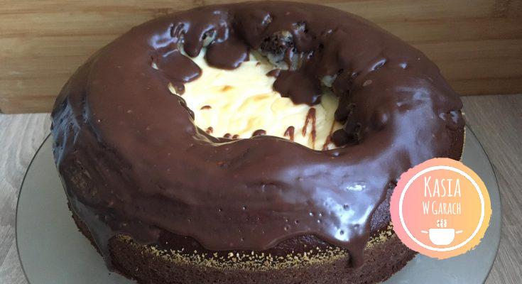 • do tortownicy przelewamy ciasto czekoladowe, centralnie na środek ciasta wylewamy jeszcze gorącą masę budyniową.