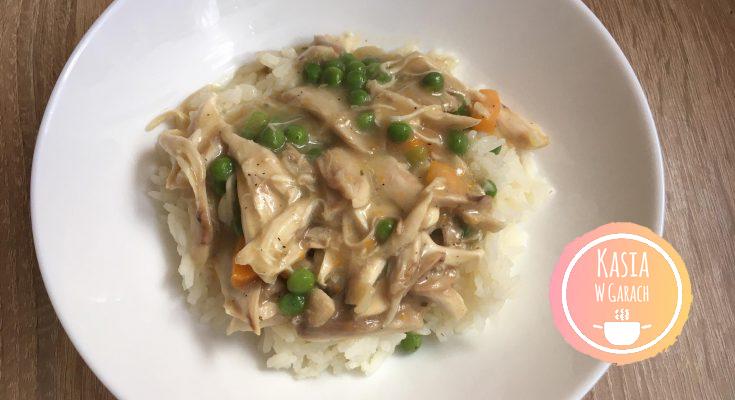 - gotujemy ok 4 minuty co jakiś czas mieszając do momentu aż sos zgęstnieje i groszek się rozmrozi. Kolejno dodajemy marchewkę i mięso. Dokładnie mieszamy aby wszystkie składniki połączyły się z sosem. Całość chwilę przygrzewamy ( nie za długo aby mięso się nie rozpadło). Doprawiamy do smaku solą i pieprzem.