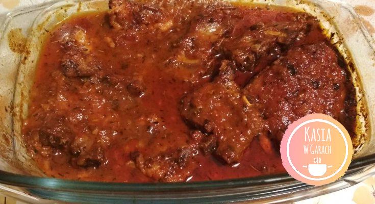 - następnie mięso przekładamy do naczynia żaroodpornego i wstawiamy do nagrzanego piekarnika do 190 stopni i pieczemy pod przykryciem ok 1,5 godziny. Przed końcem pieczenia ściągamy przykrycie aby żeberka ładnie się zrumieniły.