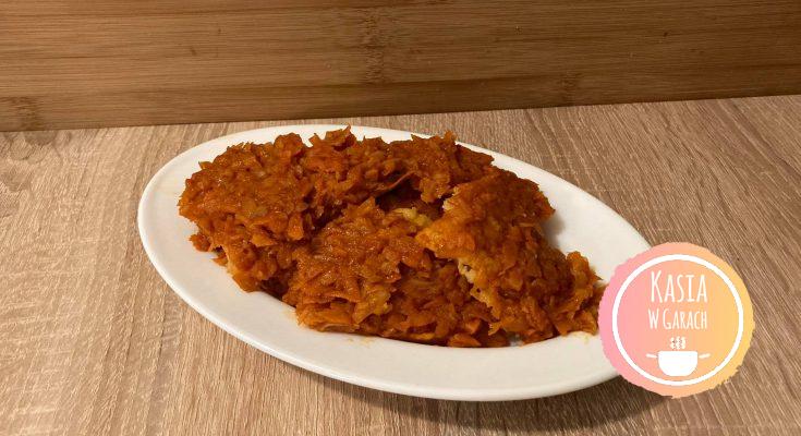 - po tym czasie wlewamy przecier pomidorowy, mieszamy i dusimy pod przykryciem co jakiś czas mieszając do momentu aż warzywa zmiękną. Na koniec doprawiamy do smaku solą i pieprzem.