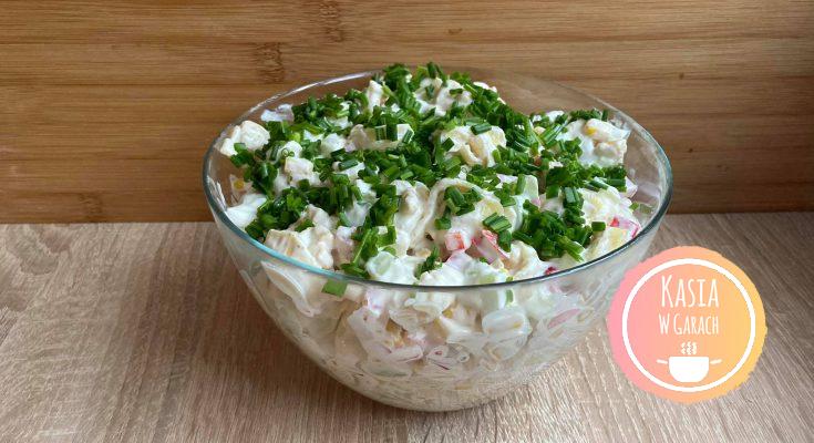 • Następnie dodajemy majonez, jogurt oraz musztardę. Dokładnie mieszamy do połączenia się z sobą wszystkich składników. Gotową sałatkę przekładamy do mniejszej miski, dekorujemy posiekanym szczypiorkiem i wstawiamy przed podaniem do lodówki do schłodzenia.