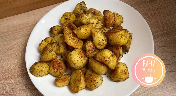 - odcedzone ziemniaki wykładamy na blachę od piekarnika wyłożoną papierem do pieczenia. Lekko skrapiamy je oliwą lub olejem, posypujemy przyprawą do ziemniaków i mieszamy przy pomocy drewnianej szpatułki lub łyżki aby wymieszały się w dokładnie z przyprawą i tłuszczem.