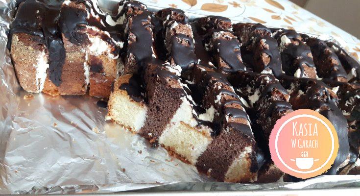 - Składanie ciasta: wystudzone placki wyciągamy z foremek i kroimy na ok 2 cm plastry. Dużą blachę na ciasto wykładamy folią aluminiową lub papierem do pieczenia. Pokrojone kromki placków smarujemy masą budyniową a następnie układamy naprzemiennie ( raz jasną a raz kakaową) w blasze do pieczenia lekko dociskając je do siebie. Jeśli zostanie nam masa to rozsmarowujemy ją po wierzchu ciasta.