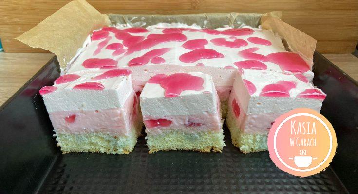 - Gdy masa śmietanowa stężeje przy pomocy łyżki po wierzchu ciasta rozprowadzamy pozostałą tężejącą galaretkę malinową.