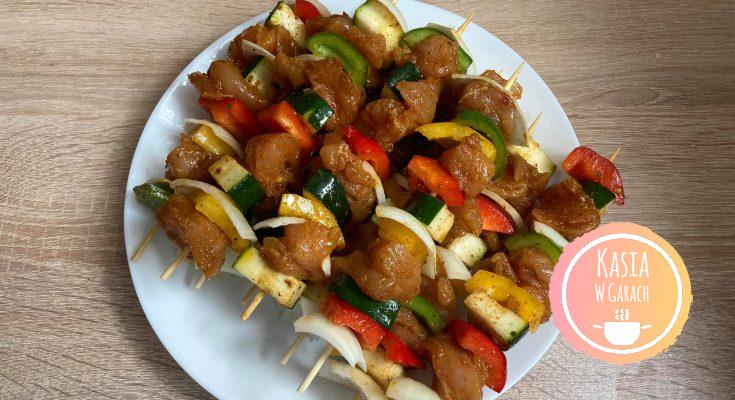 - na namoczone wcześniej w wodzie patyczki do szaszłyków nadziewamy kurczaka i warzywa w kolejności wg upodobań,