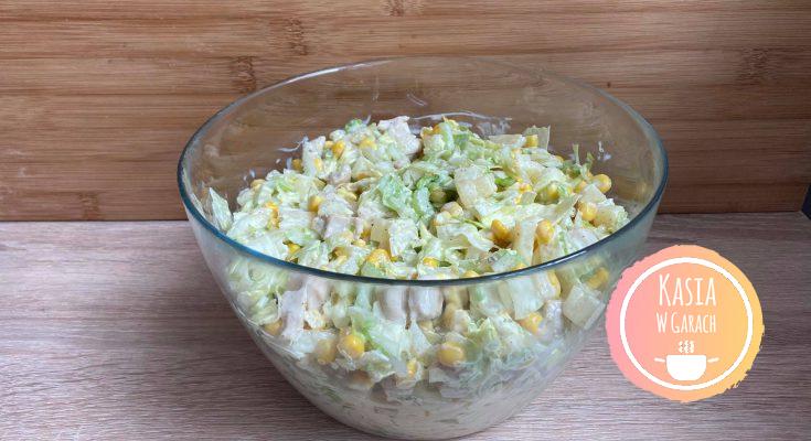 - ananasa kroimy w drobną kostkę, selera w cienkie paseczki. Sałatę drobno szatkujemy i przekładamy do dużej miski. Do miski dodajemy pozostałe składniki i dokładnie mieszamy.