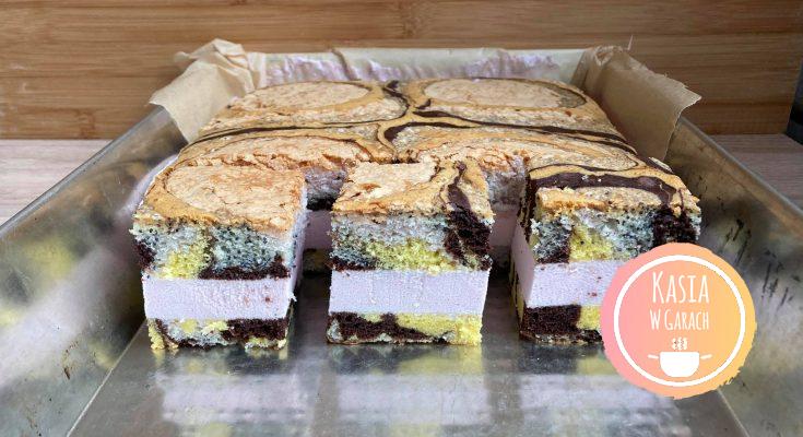 • Na spód blachy do pieczenia o wymiarach 40×26 cm wyłożonej papierem do pieczenia łyżką nakładamy 1-2 łyżki jasnego ciasta w sześciu miejscach. . Kolejno na ciasto jasne wykładamy po łyżce-dwie ciasta kakaowego, następnie makowego i z kisielem. Tak powtarzamy warstwy do wykończenia ciast.