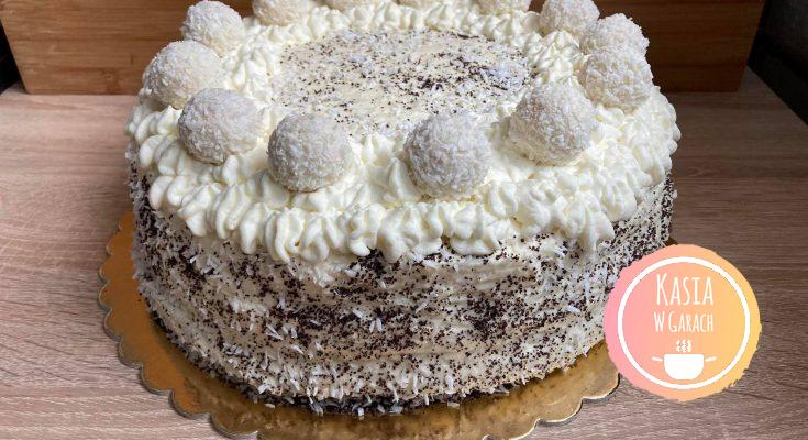 - dekoracja tortu: dobrze schłodzoną śmietankę ubijam wraz z cukrem pudrem, pod koniec ubijania dodaję jednego fixa i ubijam na sztywno. Ubitą śmietanę przełożyłam do rękawa cukierniczego i zrobiłam małe rozetki. Na wierzchu ułożyłam kokosowe praliny. Gotowy tort wstawaimy na całą noc do lodówki do schłodznia oraz aby dobrze przeszedł całym smakiem.