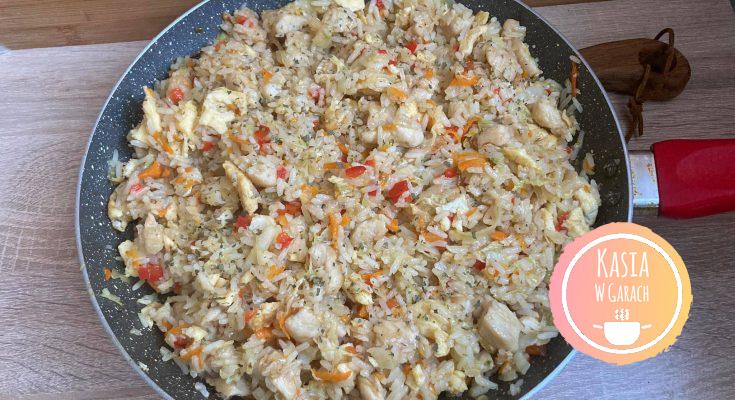- Do usmażonego kurczaka dodajemy marchewkę oraz paprykę mieszamy i smażymy około 4 min. Następnie dodajemy kapustę pekińską mieszamy i smażymy razem około 3 min. Kolejno dodajemy podsmażoną wcześniej cebulkę z czosnkiem mieszamy, dodajemy wystudzony ryż. Całość dokładnie mieszamy i smażymy razem chwilę.