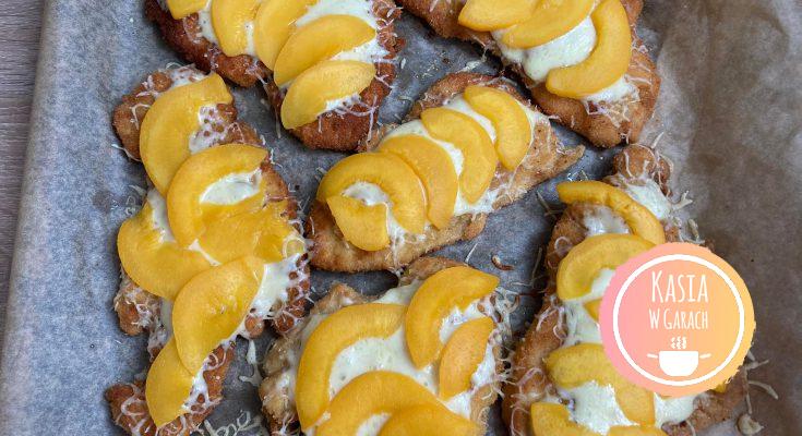 - usmażone kotlety układamy na blasze do piekarnika wyłożonej papierem do pieczenia. Posypujemy po ich wierzchu startym serem, i układamy plasterki brzoskwiń