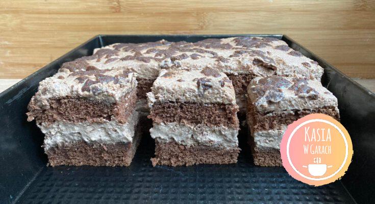 • upieczenie biszkoptu: białka wraz ze szczyptą soli ubijamy na sztywną pianę, pod koniec ubijania dodajemy cukier, gdy piana będzie sztywna i lśniąca cały czas miksując dodajemy po jednym żółtku, następnie cały czas miksując wlewamy olej. Dodajemy mąkę wraz z proszkiem do pieczenia i kakao. Mieszamy krótko tylko do połączenia się składników. Gotowe ciasto przelewamy do blachy o wymiarach 36×24 cm wyłożonej papierem do pieczenia i wstawiamy do piekarnika nagrzanego do 180 stopni (góra-dół), pieczemy ok 30 min do suchego patyczka. Upieczone ciasto odstawiamy do całkowitego ostygnięcia.