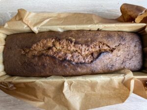 - ciasto przelewamy do dużej formy keksowej lub tortownicy wyłożonej papierem do pieczenia. Ja użyłam formy o wymiarach 34×13 cm.