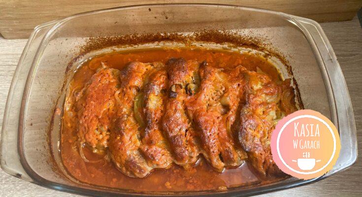 - Na dno naczynia żaroodpornego układamy plaster karkówki, smarujemy go sosem i wykładamy trochę cebuli. Przykrywamy kolejnym plastrem karkówki, smarujemy sosem i układamy cebulę. Tak powtarzamy do wykończenia składników. Mięso układamy na zakładkę.