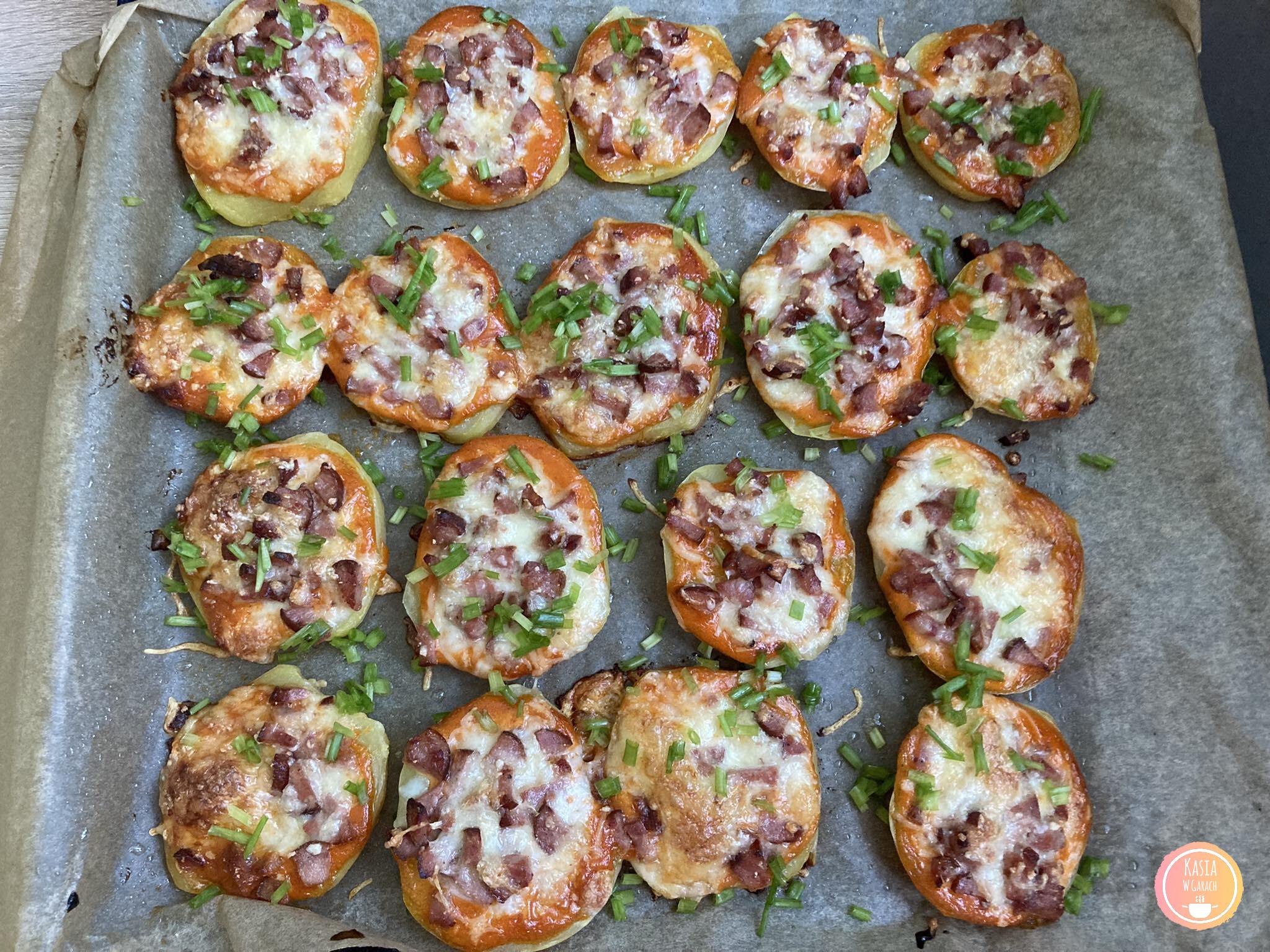 - Następnie układamy podgotowane plastry ziemniaków. Każdy smarujemy sosem i wykładamy dodatki dociskając je lekko do sosu i ziemniaków.