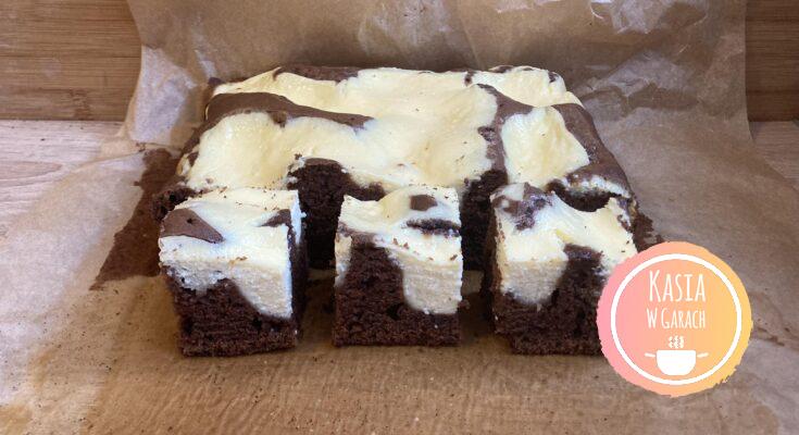 • ciasto kakaowe przelewamy do blaszki wyłożonej papierem do pieczenia. Ja użyłam formy o wymiarach 31×21 cm. Na ciasto łyżką nakładamy kleksy z masy serowej.
