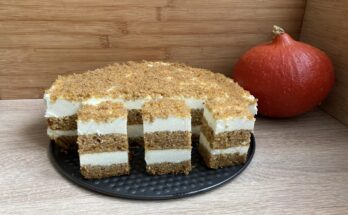 Dyniowy przekładaniec to ciasto puszyste, lekkie i wilgotne. Po prostu przepyszne. Z lekko korzenną nutą. Idealne na poobiedni deser, na co dzień i od święta. Wyśmienicie smakuje w sezonie jesienno-zimowym …