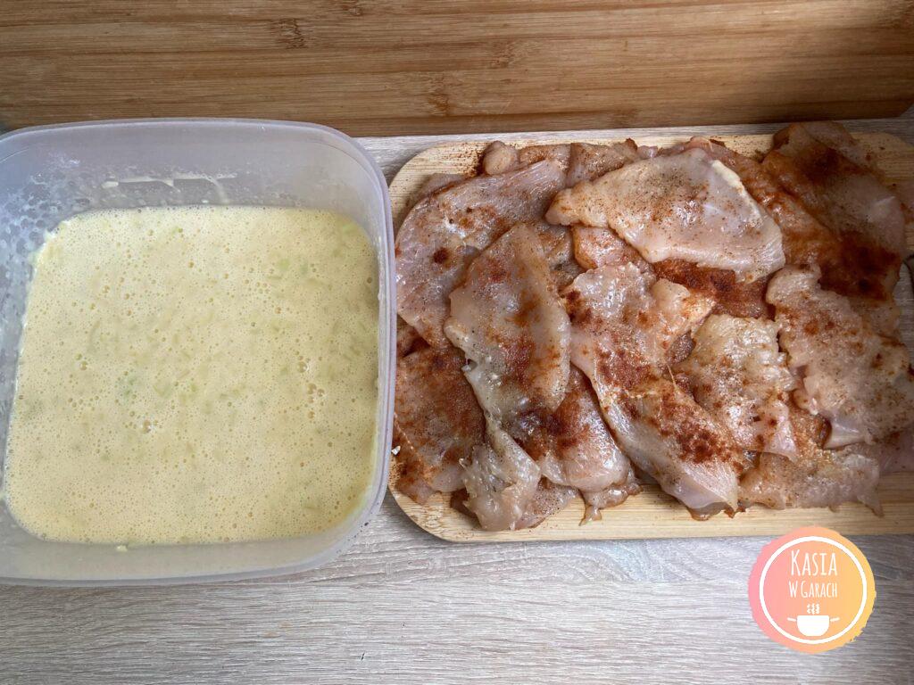 - W międzyczasie piersi z kurczaka kroimy w poprzek na płaskie kotlety, które lekko rozbijamy tłuczkiem( staramy się aby wszystkie kawałki były mniej więcej tej samej grubości), Mięso z obu stron przyprawiamy solą, pieprzem oraz słodką papryką.