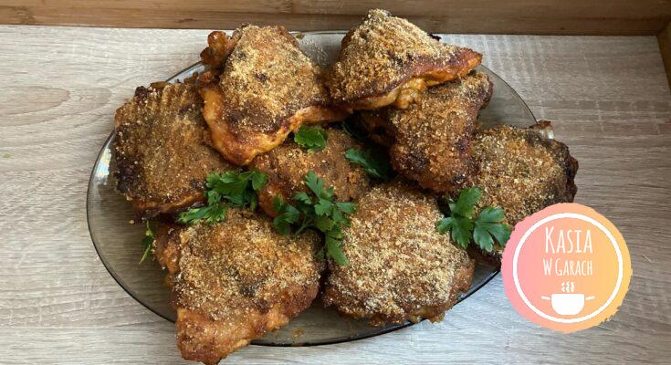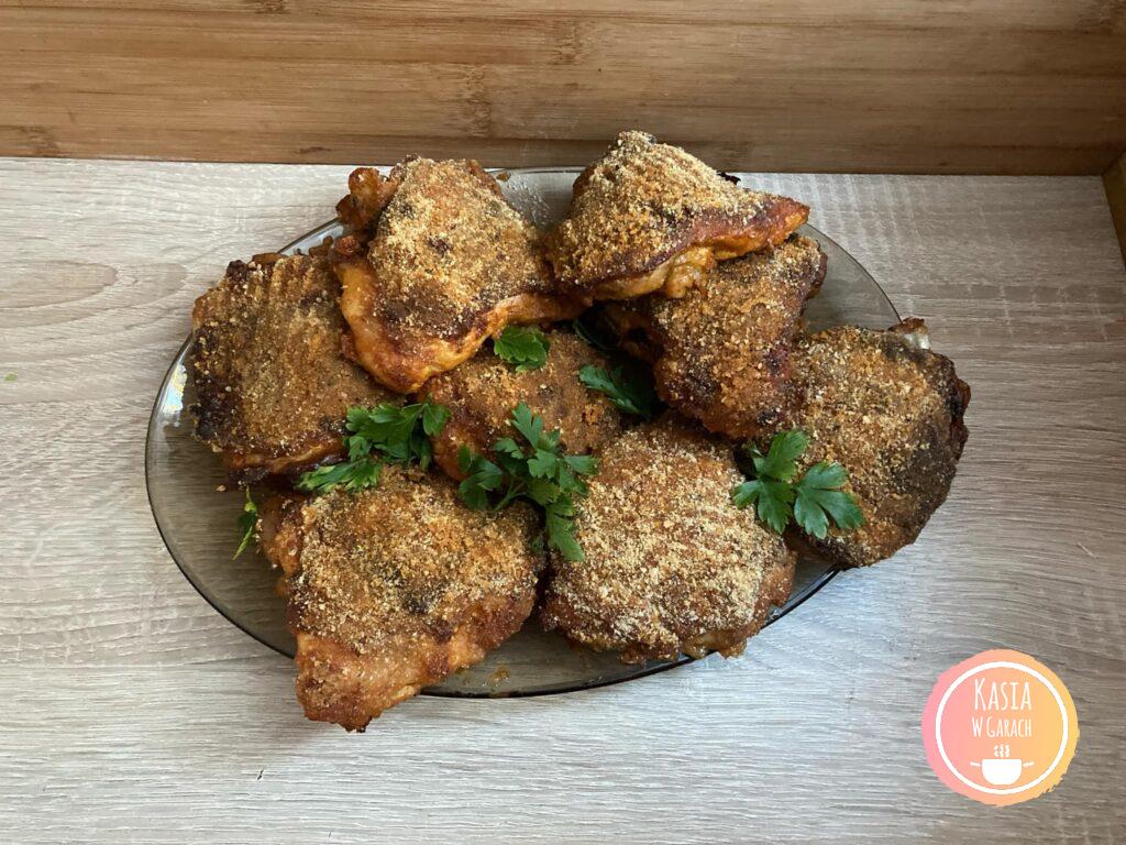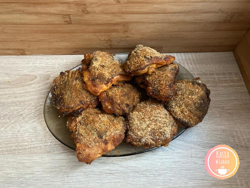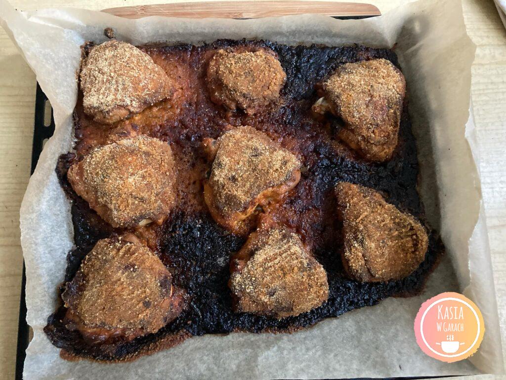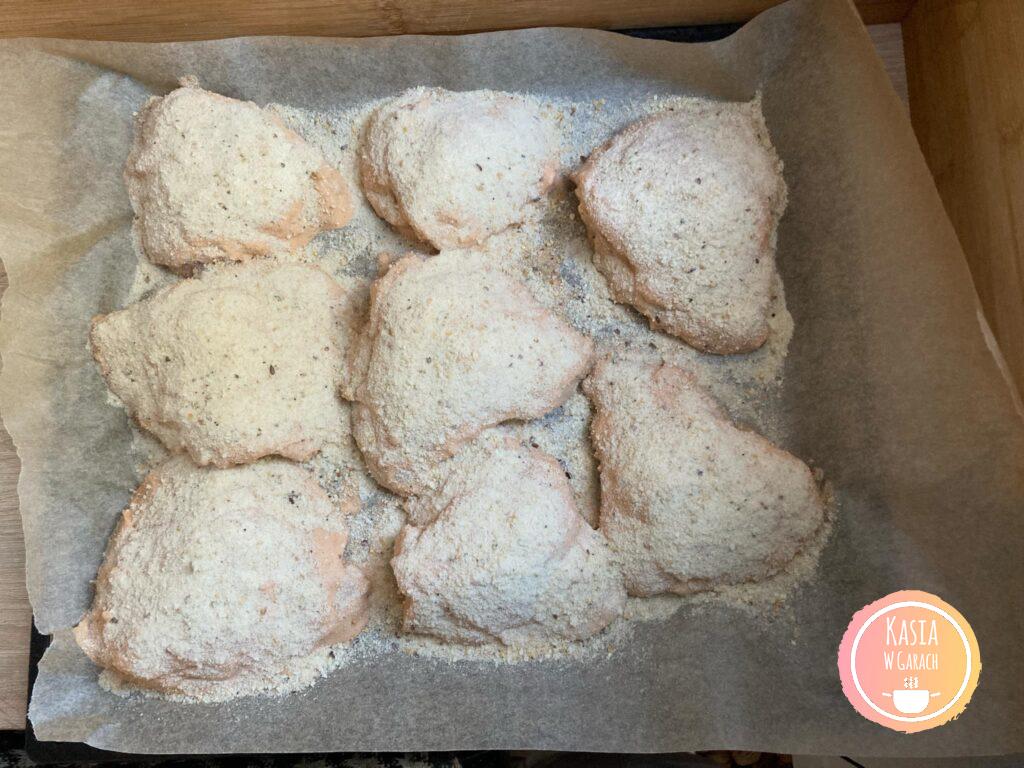 - Po tym czasie udka wykładamy na blachę od piekarnika wyłożoną papierem do pieczenia. Każde udko posypujemy bułką tartą i wstawiamy do nagrzanego piekarnika do 190 stopni grzanie (góra-dół).