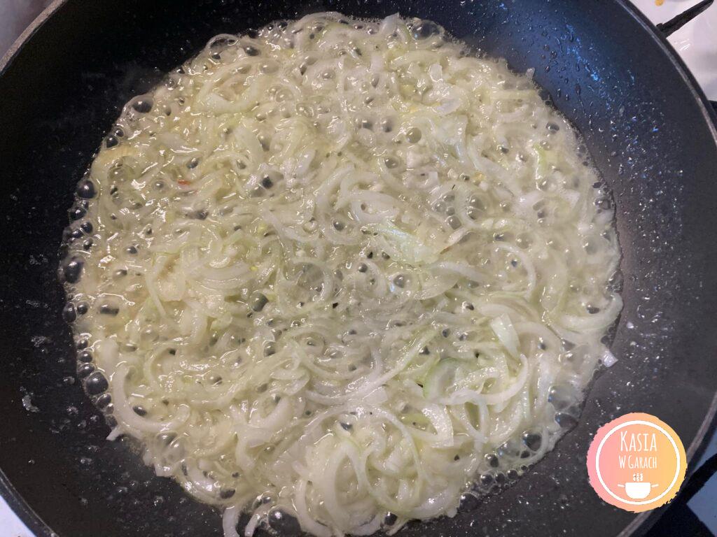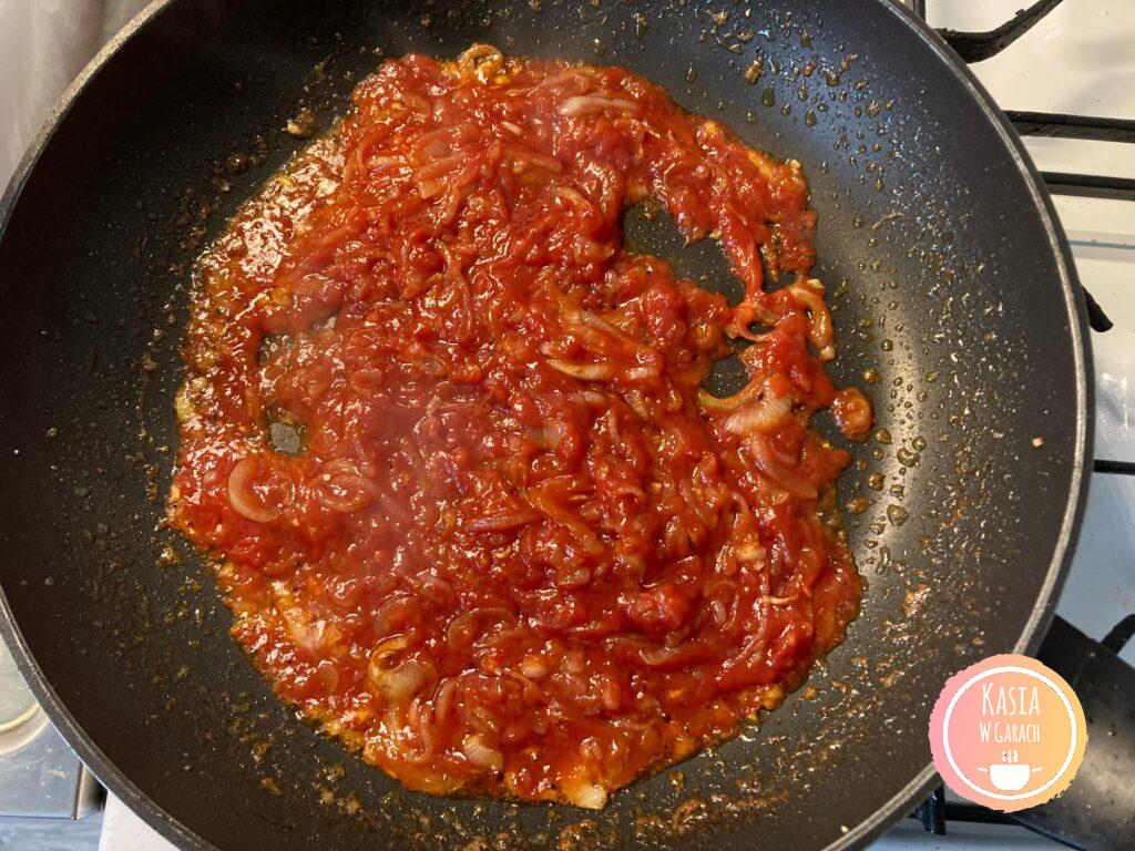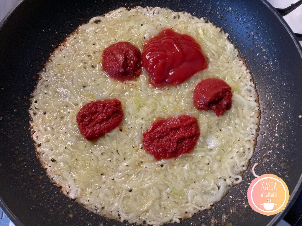- Na patelni na oleju podsmażamy cebulę kilka minut wraz z cukrem, mieszając aż się ładnie skarmelizuje. Po tym czasie dodajemy czosnek, koncentrat pomidorowy i ketchup. Mieszamy i chwilę razem smażymy.