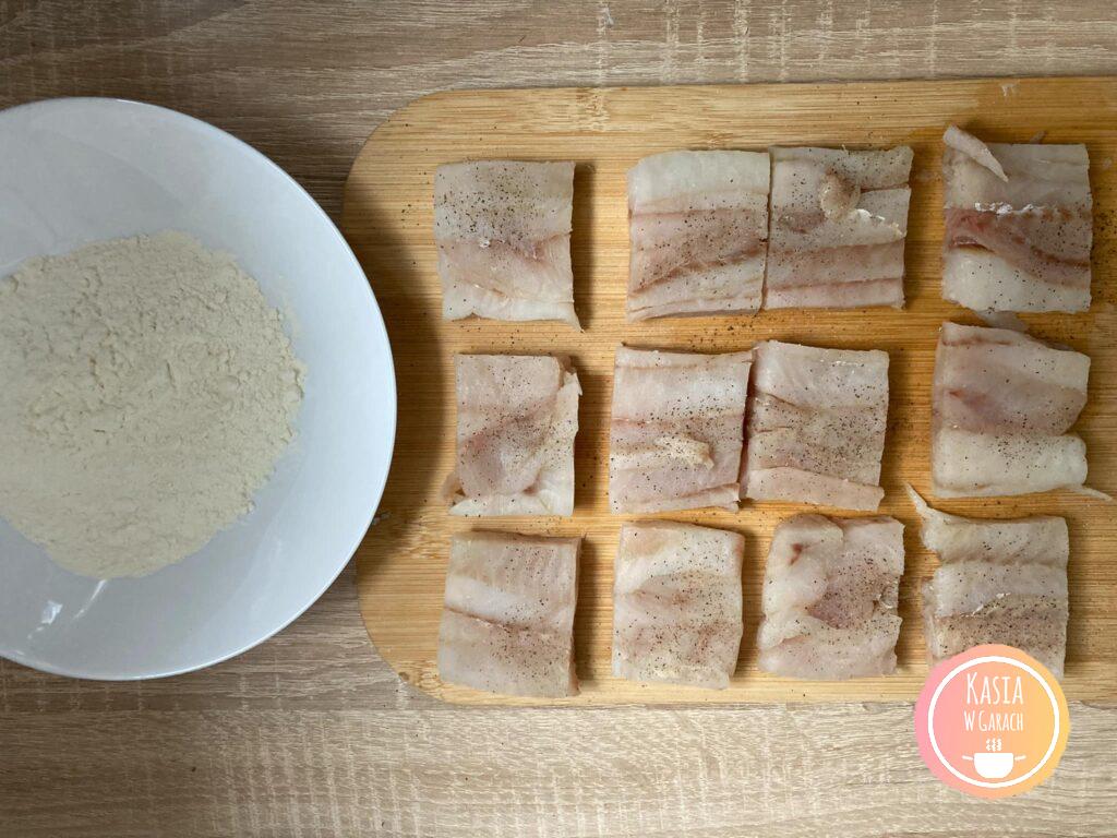 - rozmrożoną rybę osuszamy. Kroimy na mniejsze kawałki. Z każdej strony doprawiamy solą oraz pieprzem. Każdy kawałek ryby obtaczamy w mące i smażymy na patelni z obu stron na rumiano.
