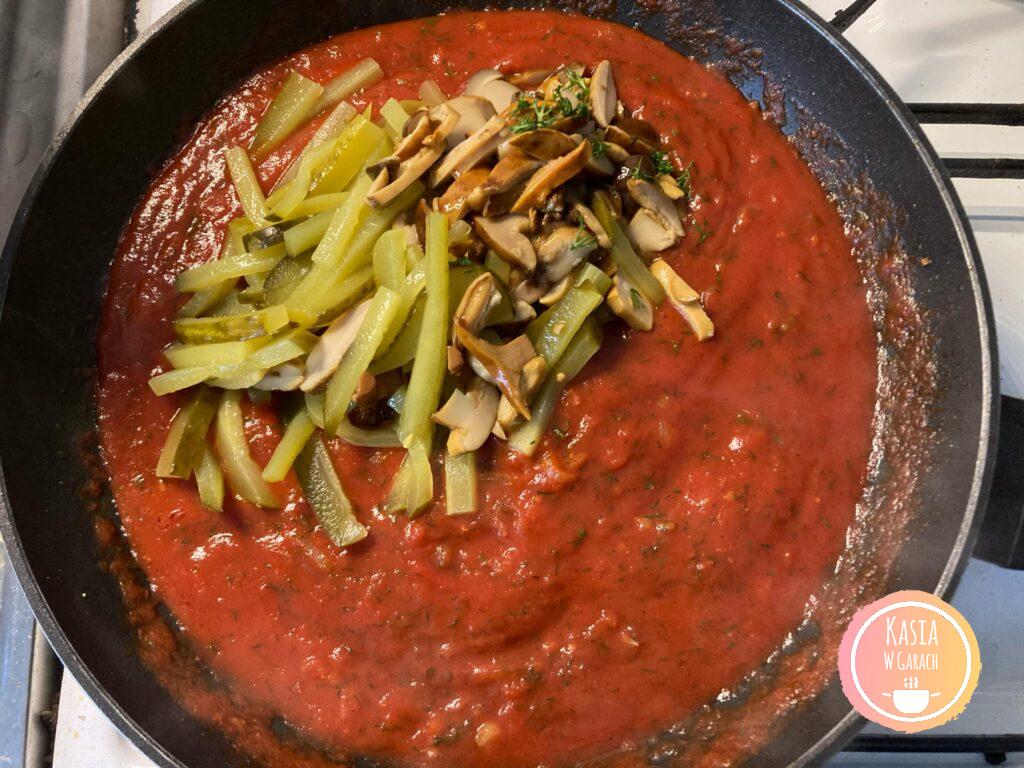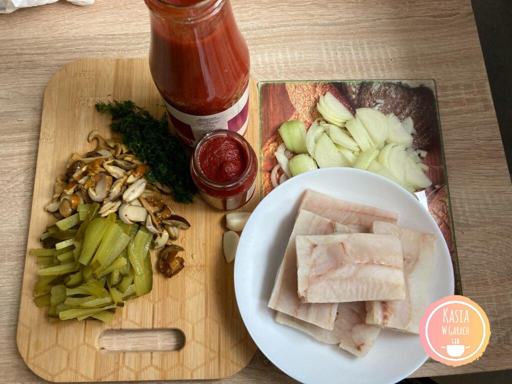 - Następnie wlewamy passatę, mieszamy i doprawiamy do smaku solą, pieprzem oraz ostrą papryczką. Zagotowujemy. Wyłączamy gaz, dodajemy posiekany koperek, ogórki i grzybki. Całośc dokładnie mieszamy, odstawiamy i bierzemy się za przygotowanie ryby.