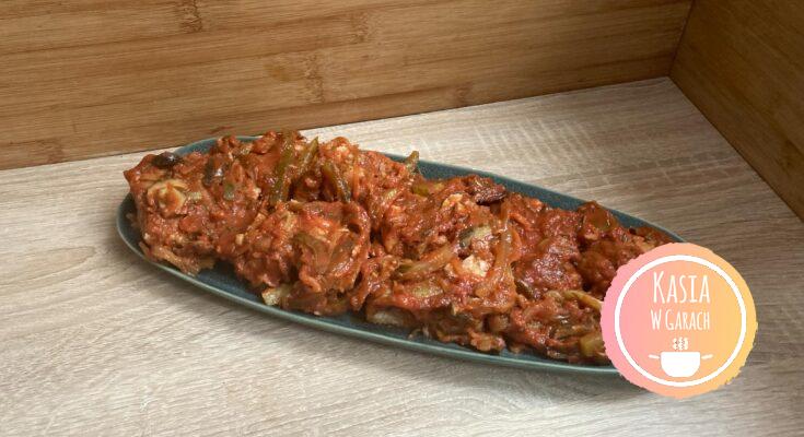 • Na patelni na oleju podsmażamy cebulę kilka minut wraz z cukrem, mieszając aż się ładnie skarmelizuje. Po tym czasie dodajemy czosnek, koncentrat pomidorowy i ketchup. Mieszamy i chwilę razem smażymy.