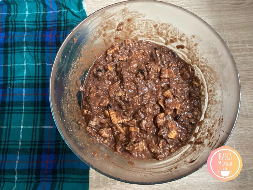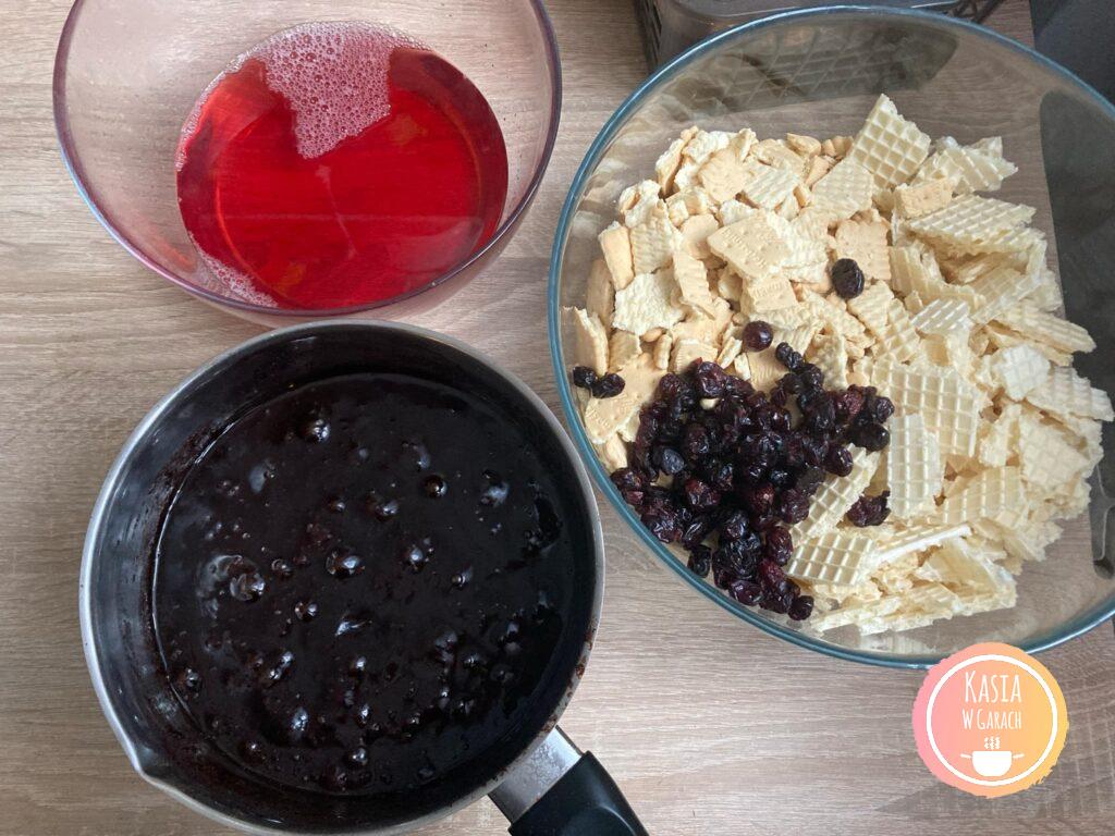 • do miski z pokruszonymi ciastkami i bakaliami wlewamy galaretkę oraz polewę. Dokładnie mieszamy aż wszystko się z sobą połączy. Odstawiamy do momentu gdy masa będzie tężeć, co jakiś czas mieszając.
