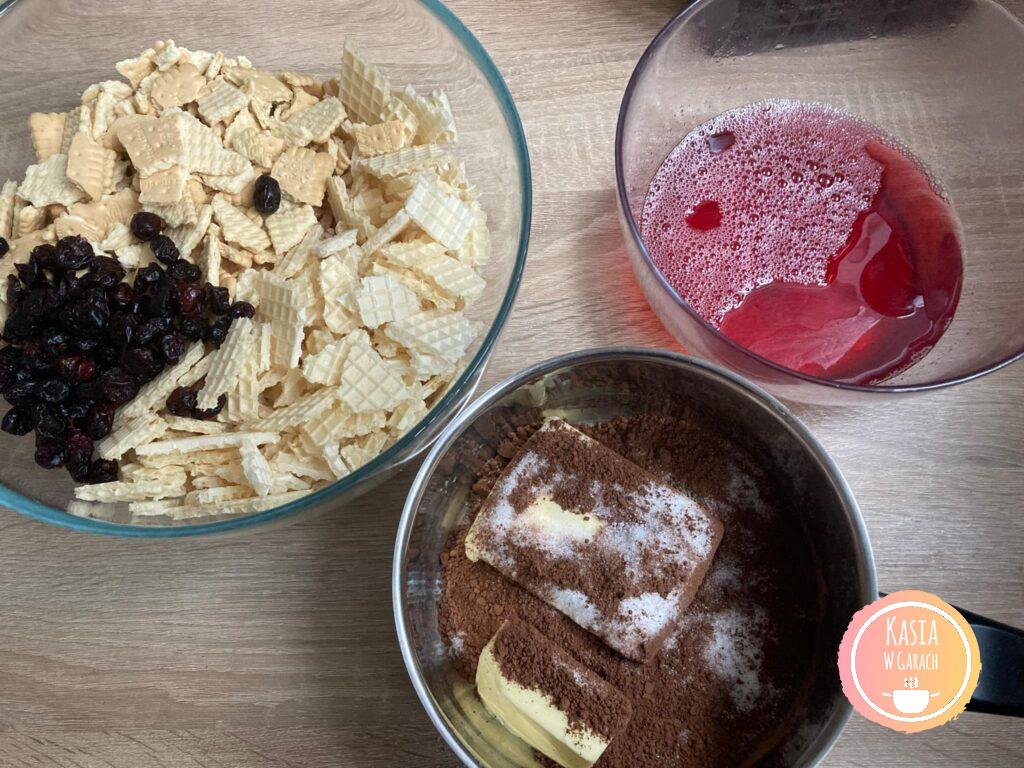 • pozostałe płaty wafli i herbatniki rozkruszamy na dość drobno i przekładamy do dużej miski. Dodajemy 2 garści suszonych owoców.