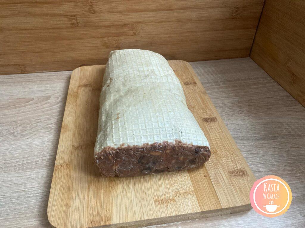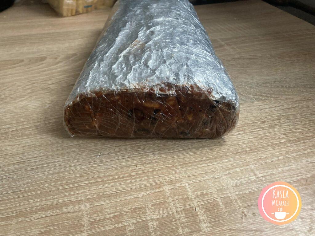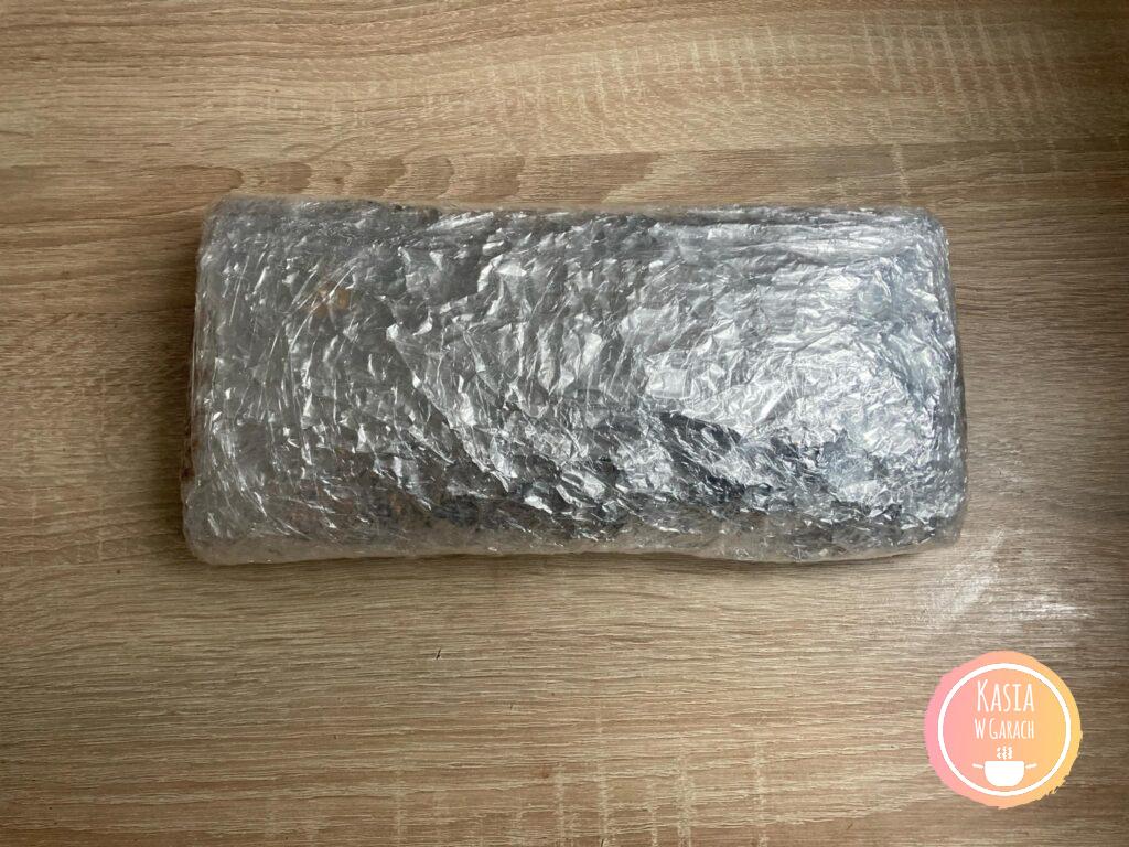 • Zwiniętą roladę szczelnie owijamy z każdej strony folią spożywczą nadając jej kształt. Delikatnie wstawiamy do lodówki i chłodzimy całą noc aż dobrze stężeje.