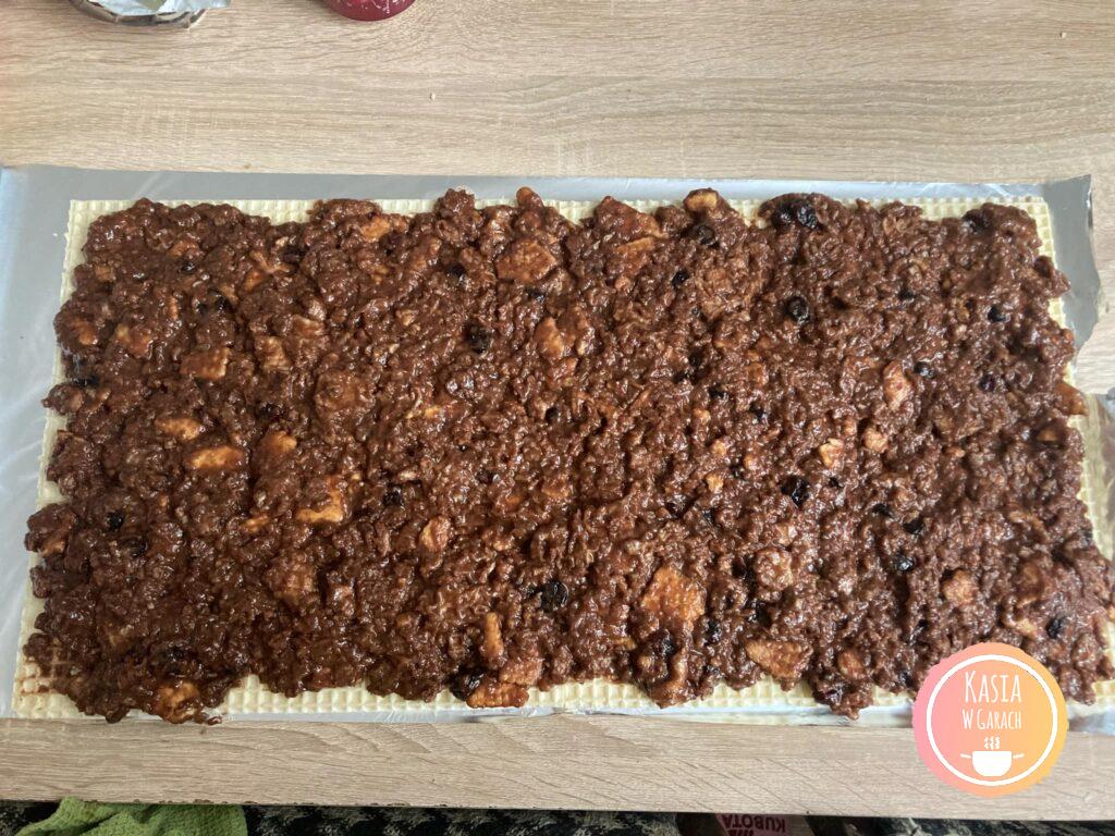 • na folię aluminiową lub spożywczą układamy dwa płaty wafla obok siebie. Na wafle wykładamy jeszcze ciepłą ale już tężejącą masę. Równomiernie rozprowadzamy po całości wafla zostawiając trochę miejsca przy samych brzegach.