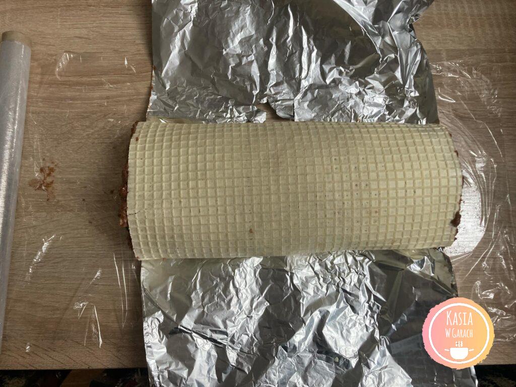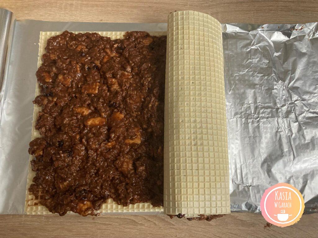 • pomału zaczynamy zwijać wafla tworząc roladę. Jeśli masa zacznie nam wychodzić bokami, dociskamy ją do środka nożem lub szpatułką.